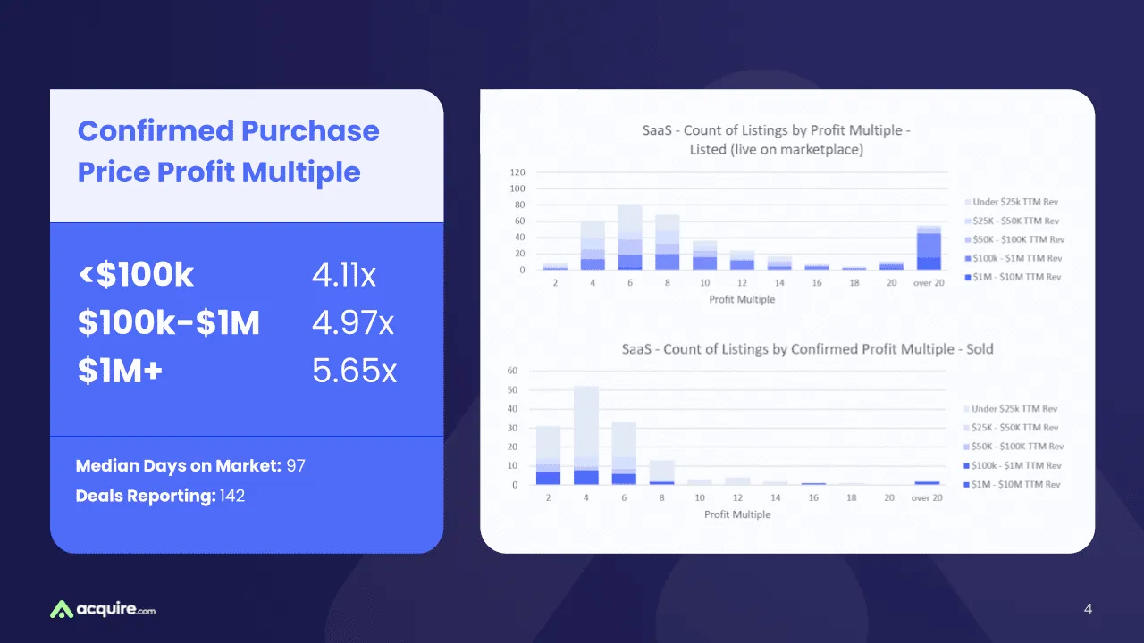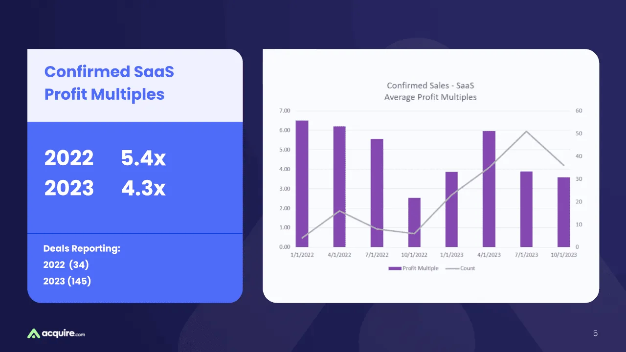 The latest report, published in January 2024, highlights that on average, SaaS businesses were acquired at a 4.3x Trailing Twelve Months (TTM) profit multiple.