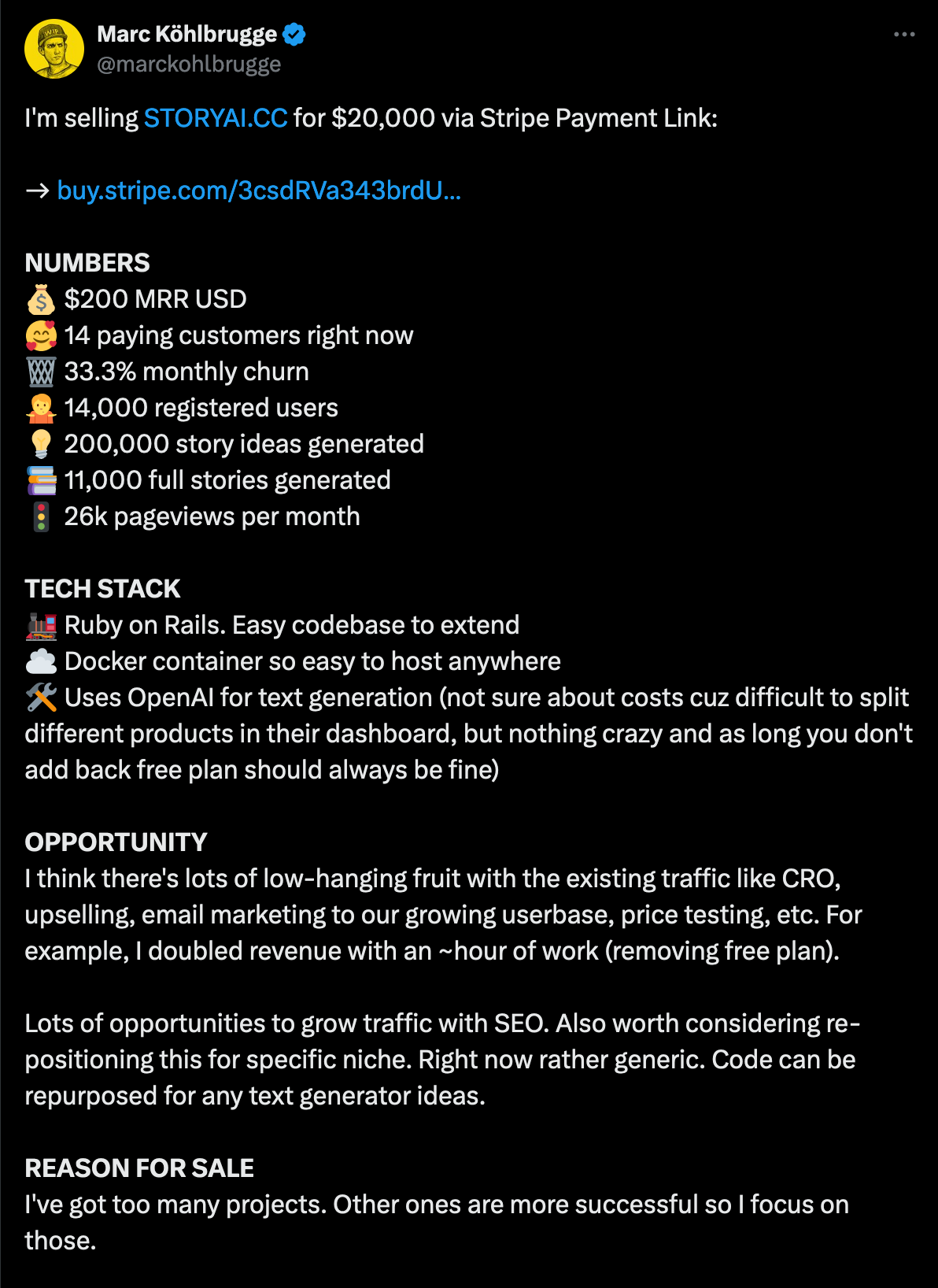 But some are even selling their business pro actively on Twitter (X), as seen in the example below by Marc Kohlbrugge. The MRR to price ratio is debateable, but the traction is impressive nonetheless: